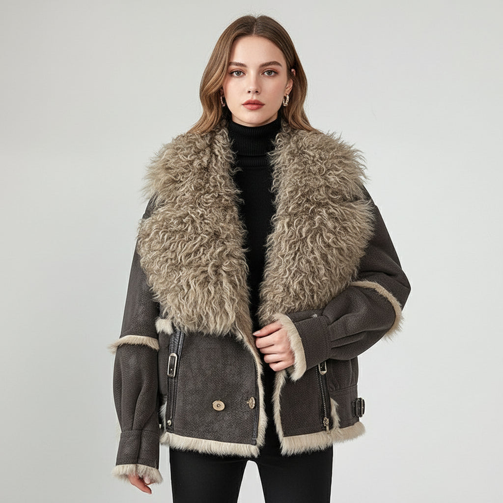 Made from genuine leather wool and designed with a soft rabbit fur composition, this stylish short-length jacket combines elegance with comfort. Featuring a classic wool fur collar, raglan long sleeves, and chic pocket detailing, it reflects a refined British style with a modern temperament commute touch.